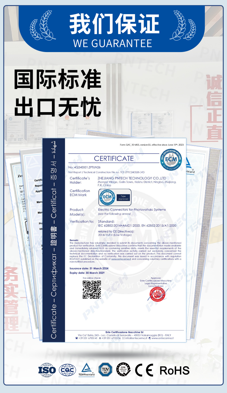 产品标准:IEC62852:2014 CE 额定电压:1000V DC 防护等级:IP65