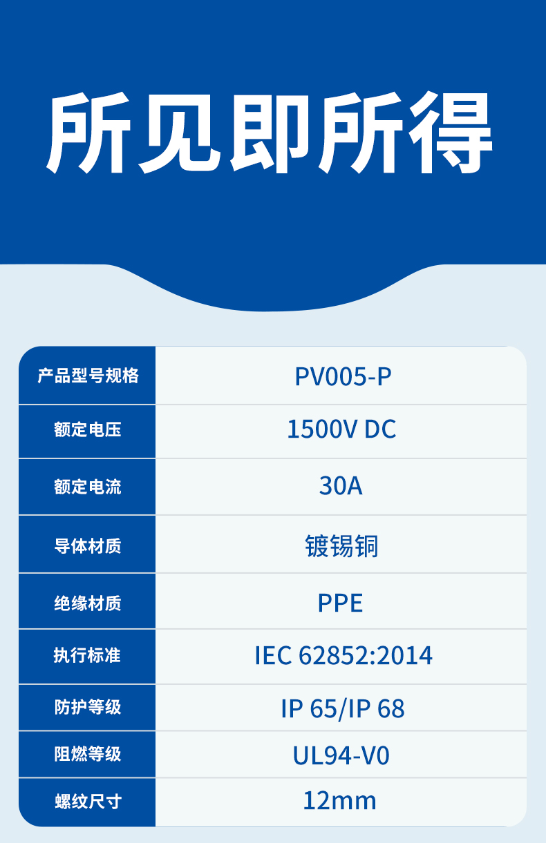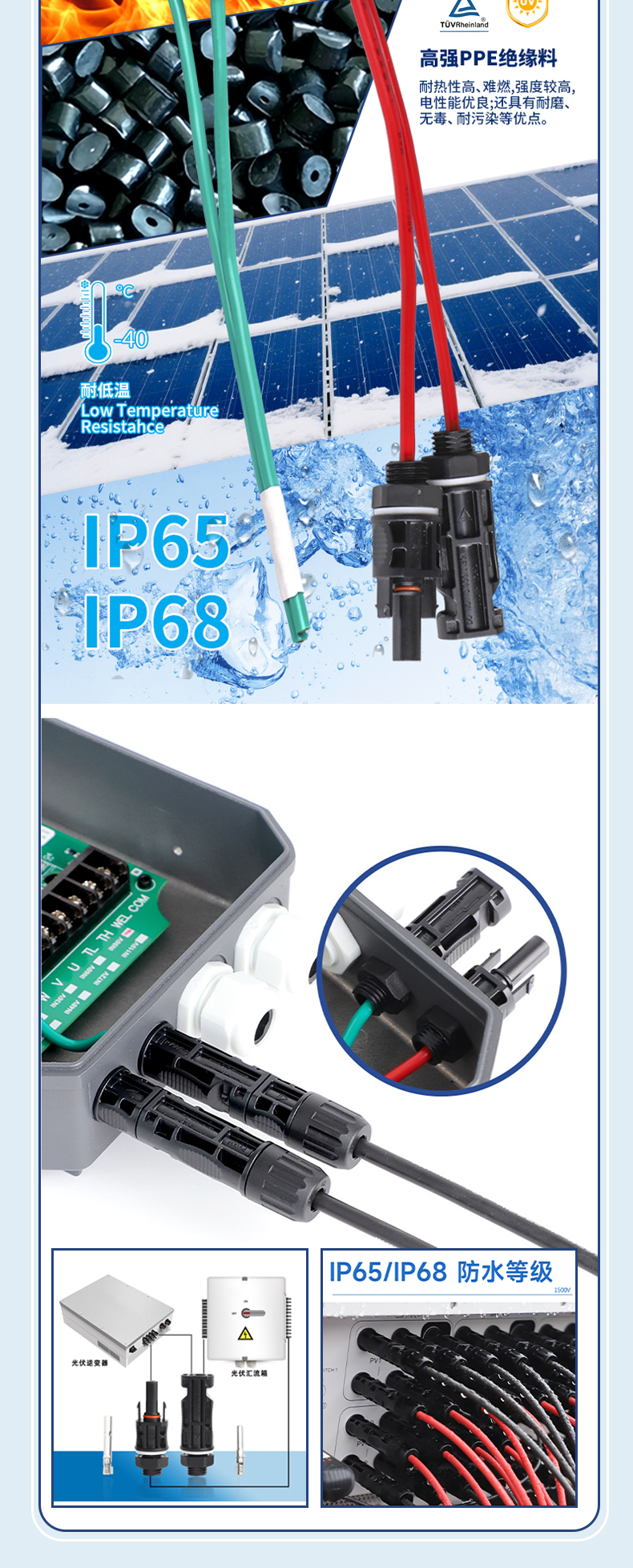 产品标准:TUV认证 额定电压:1500V DC 防护等级:IP65